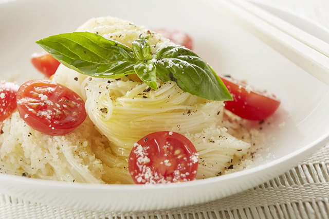 夏の定番そうめんを、オリーブオイルであえて、旬のトマトや、香りさわやかなバジルを合わせるメニューです。