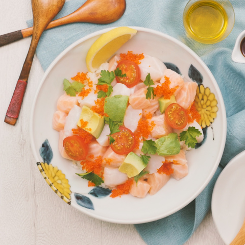 - サーモン、ほたて貝柱は2cm角に切り、レモン汁をまぶす。アボカドは2cm角、ミニトマトは4等分に切る。ハーブは粗く刻む。