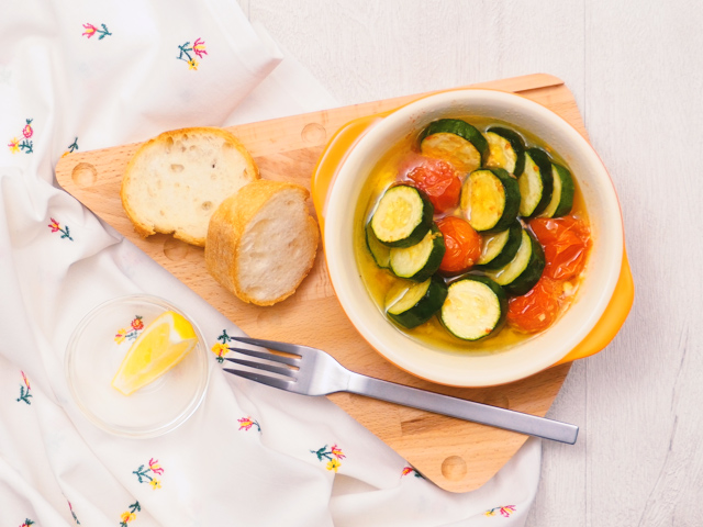 今回はズッキーニとミニトマトをご提案。夏が旬のズッキーニは実はカボチャの仲間で、ほのかな甘みが魅力の野菜です。ズッキーニもトマトも油との相性が良く、オリーブオイルで煮ることで、甘みが増して、さらに栄養成分の吸収率がアップします。いずれも生のままオイルに入れ、食感が残る程度に短時間でサッと煮るのがポイント。残りオイルには、野菜やチーズのうま味がたっぷりでているので、バゲットなどにつけて楽しんでください♪